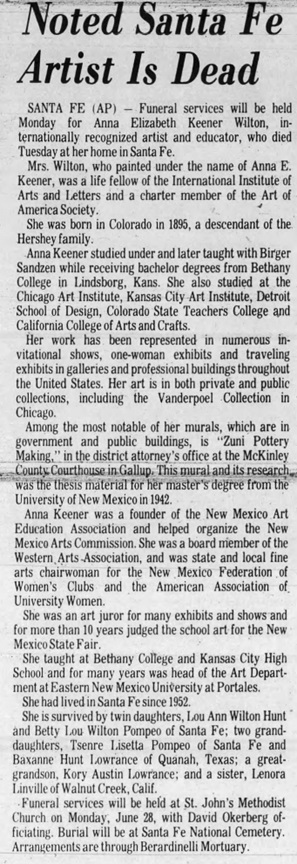 “Noted Santa Fe Artist is Dead.” Carlsbad Current-Argus, Carlsbad, New Mexico. June 25, 1982. Ancestry.com.