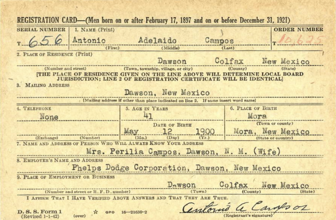 As World War II approached, Antonio registered on February 16, 1942, in Dawson. However, no records indicate he served in World War II. At the time, he was 41 years old and employed at the Phelps Dodge Corporation in Dawson, New Mexico, where he also resided[iv].