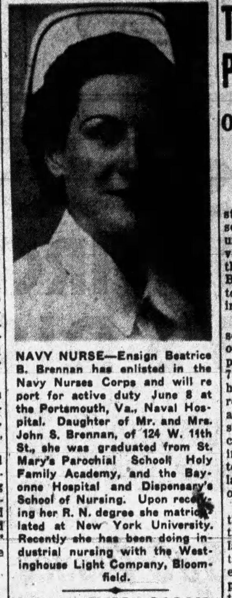 1. “Navy Nurse,” The Bayonne Times, May 26, 1943, 2. Newspapers.com.
