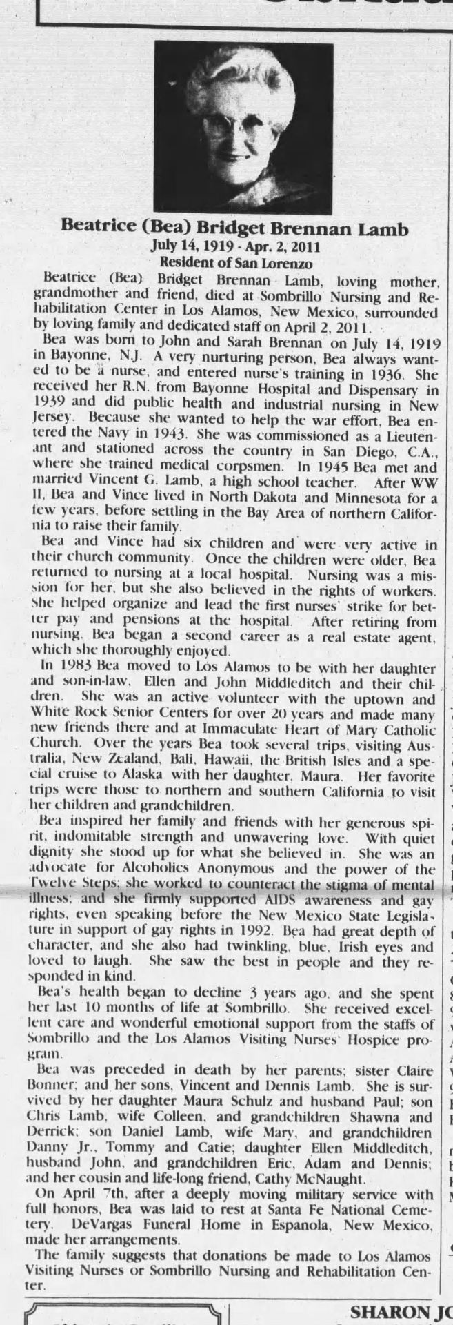 2. “Beatrice “Bea” Bridget Brennan Lamb,” Oakland Tribune, April 24, 2011, 33. Newspapers.com.