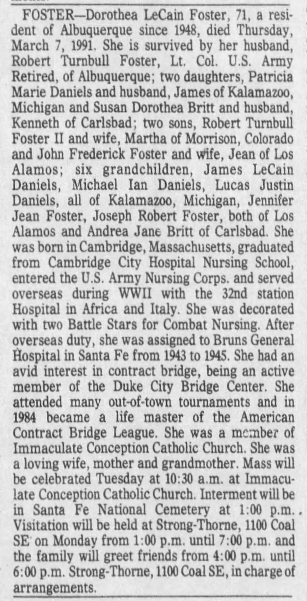 LeCain Foster was born in Cambridge, Massachusetts to John and Mary McGrath LeCain 4. As a child, she was involved in the Girl Scouts. 5 After the war, she met Lt. Col. Robert Turnbull Foster at Bruns General, and they married in July of 1946 and had four children, Patricia Marie, Robert Turnbull II, John Frederick, and Susan Dorothea. 6, 7 LeCain Foster moved to Albuquerque in 1948. 1 She had an avid interest in contract bridge, being a member of the Duke City Bridge Center. 1, 8 She attended many out-of-town tournaments and in 1984 became a life master of the American Contract Bridge League. 1 In 1982, she attended the reunion of the 32nd Station Hospital in St. Peterburg, Florida. 9