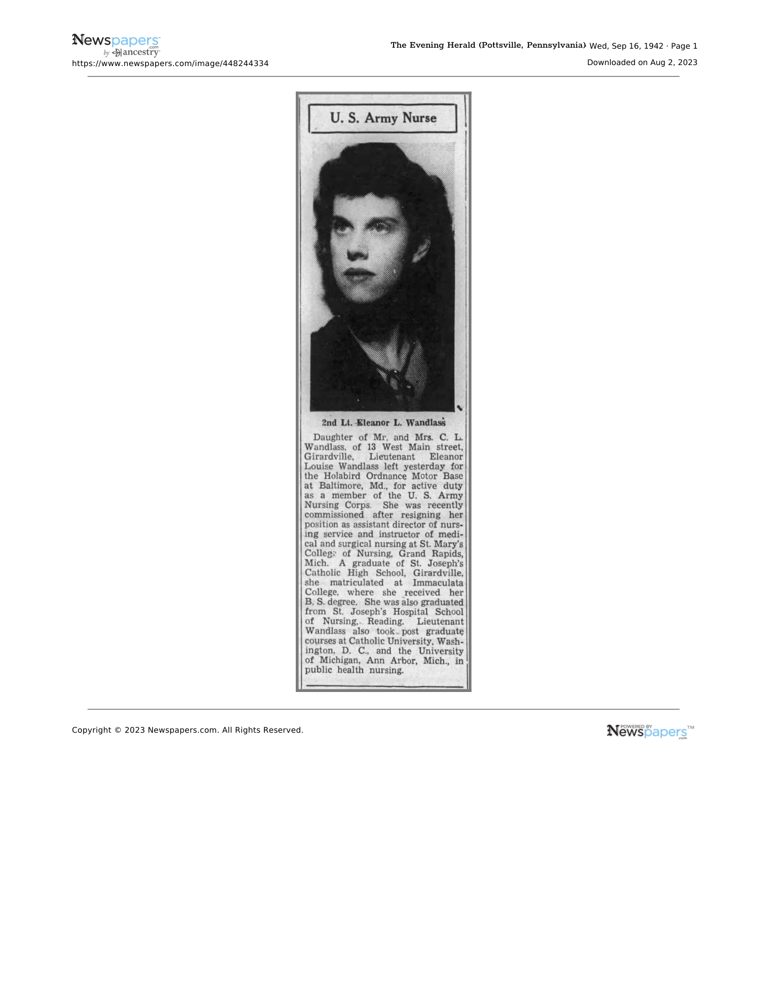 “2nd Lieutenant Eleanor L. Wandlass.” Evening Herald. Pottsville, Pennsylvania. 16 September 1942. Retrieved: 2 August 2023. https://www.newspapers.com/image/448244334