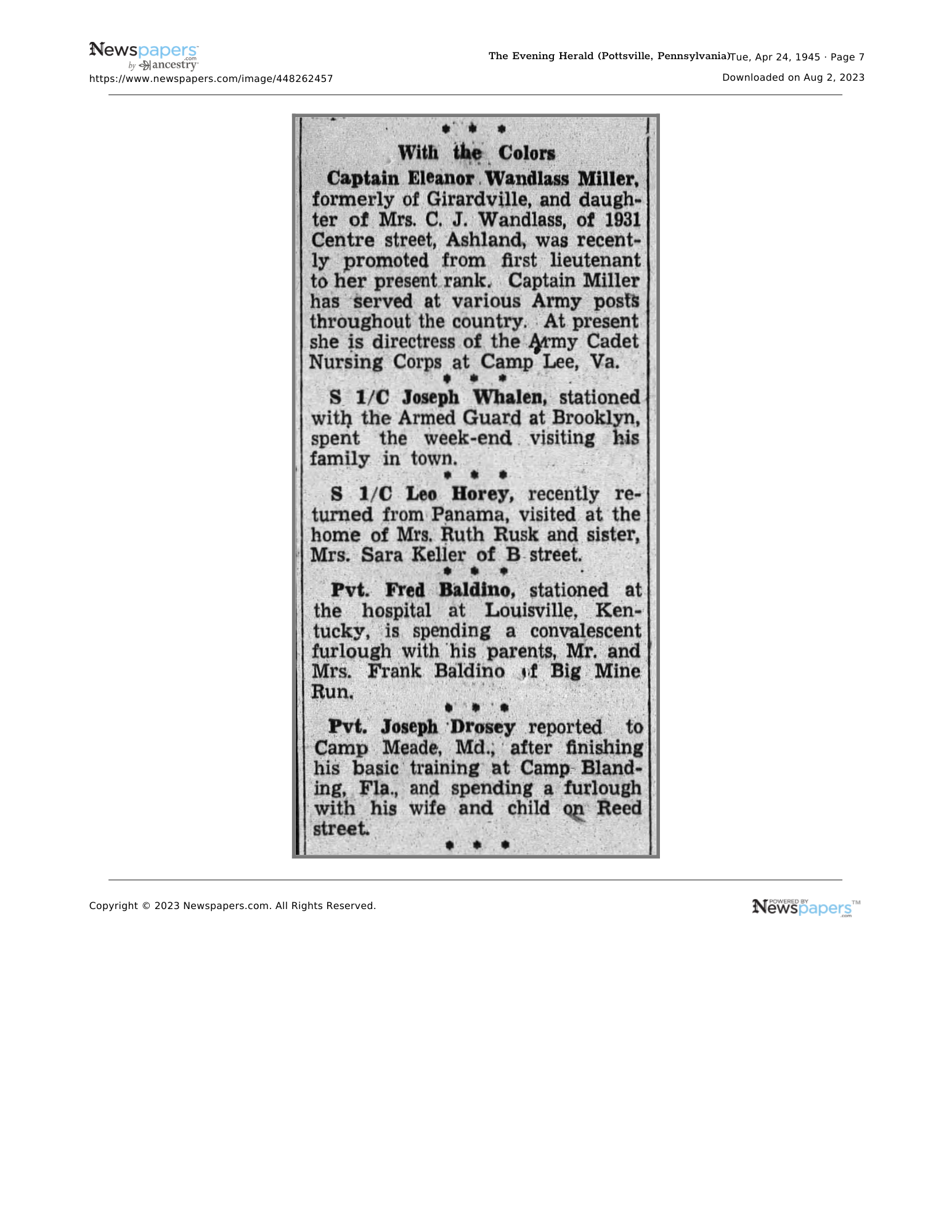 7 & 8. “With the Colors.” Evening Herald. Pottsville, Pennsylvania. 24 April 1945. p. 7.