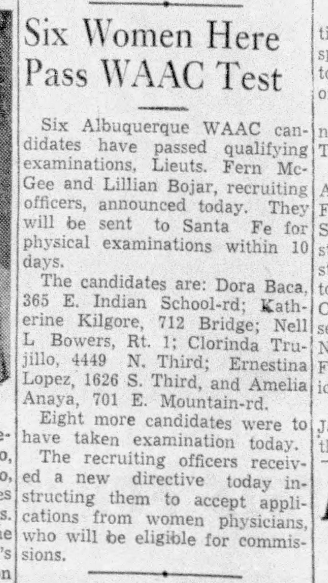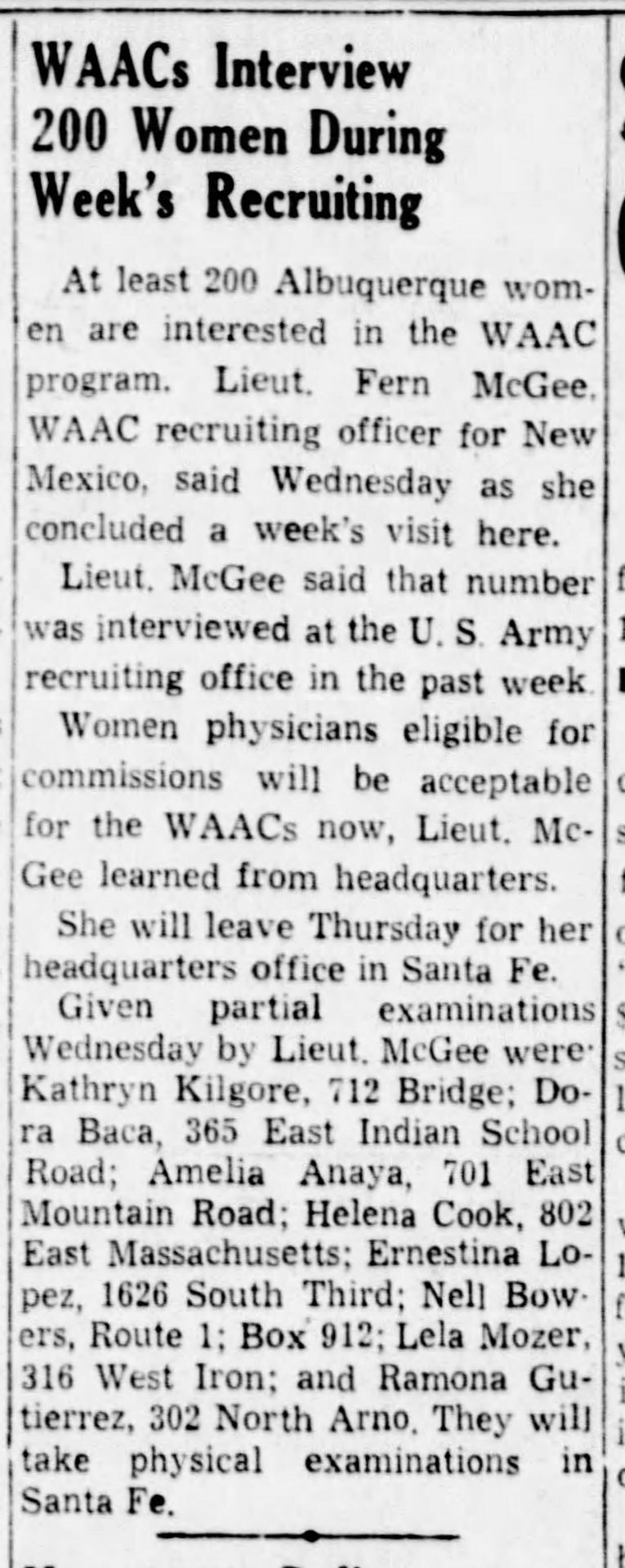 “WAACS Interview 200 Women during Week’s Recruiting,” Albuquerque Journal, December 17, 1942, 2. Newspapers.com.
