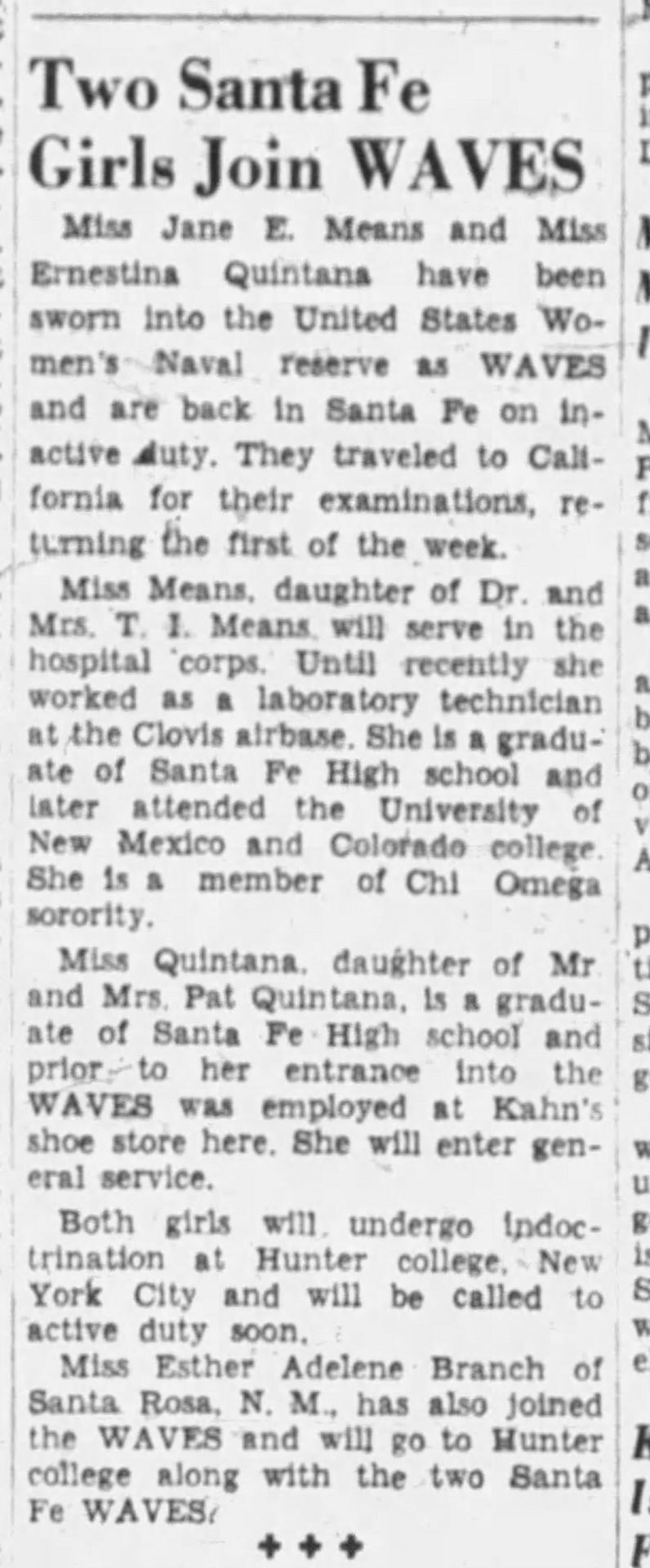 “Jane Means and Ernestine Quintana Receive Navy Congratulations; Take Oath as WAVES,” Santa Fe New Mexican, May 14, 1943, 3. Newspapers.com.