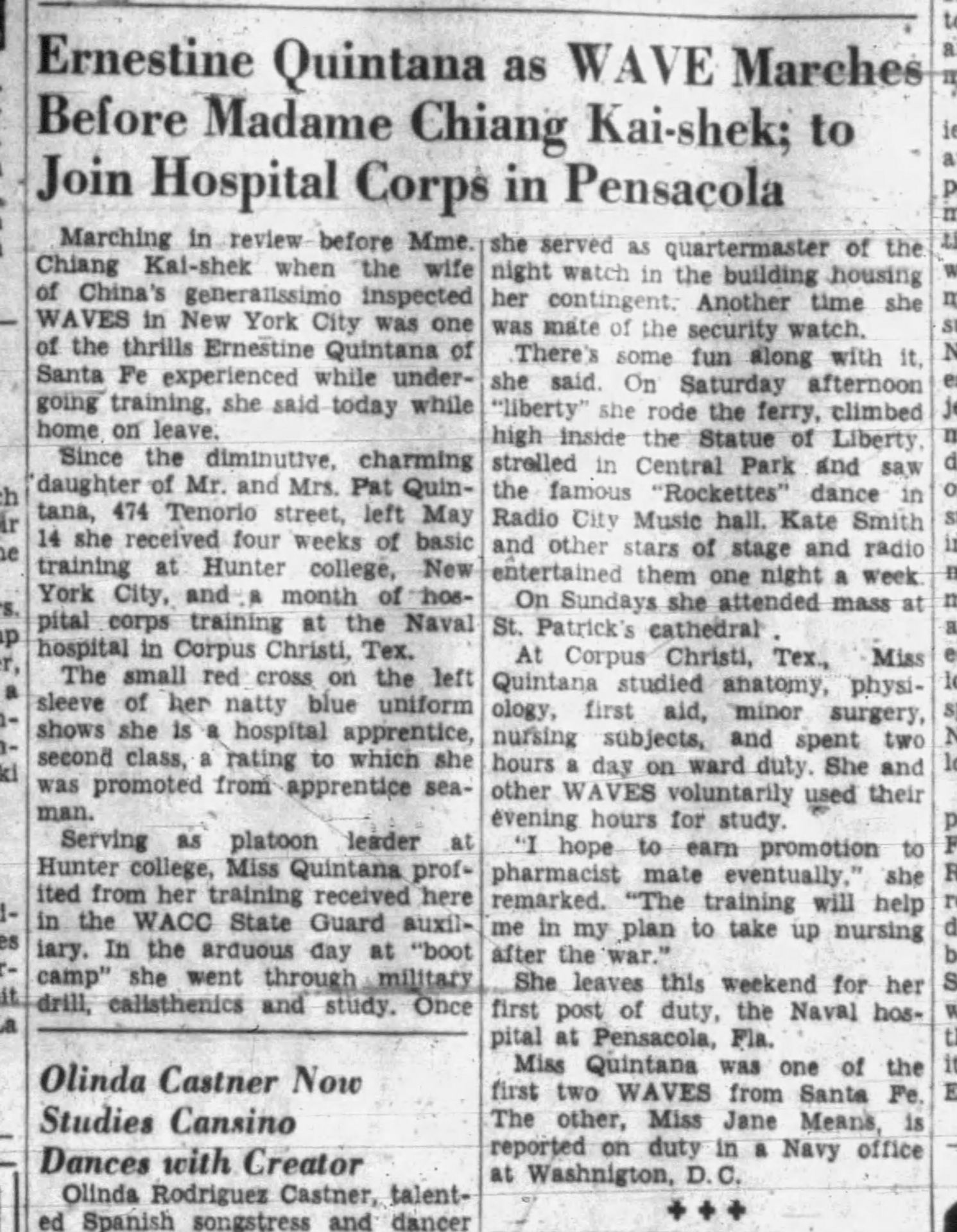 “Ernestine Quintana as WAVE Marches before Madam Chiang Kai-shek; to Join Hospital Corps in Pensacola,” The Santa Fe New Mexican, July 21, 1943, 3. Newspapers.com.