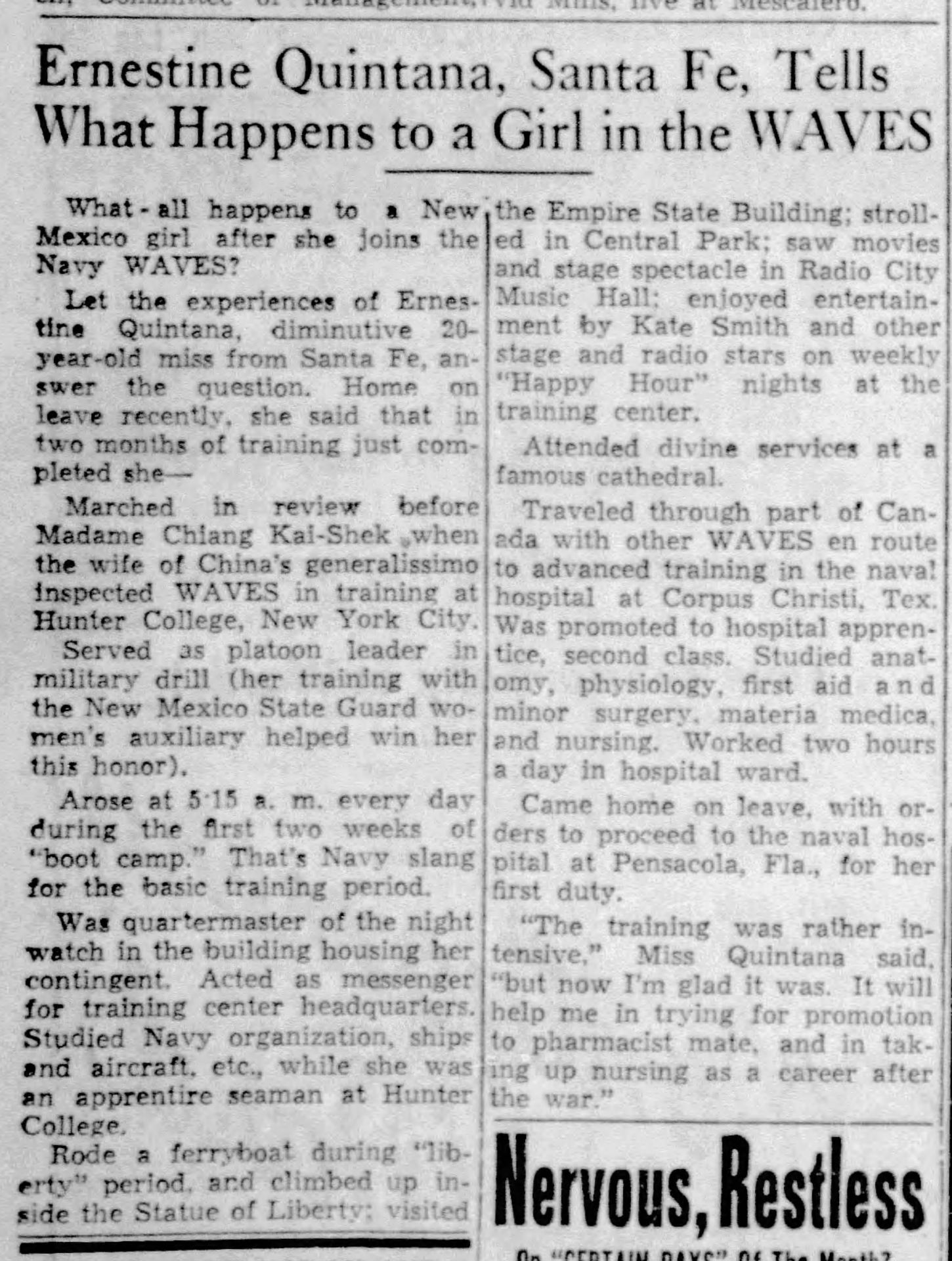 “Ernestine Quintana, Santa Fe, Tells What Happened to a Girl in the WAVES,” The Albuquerque Tribune, July 23, 1943, 4. Newspapers.com.
