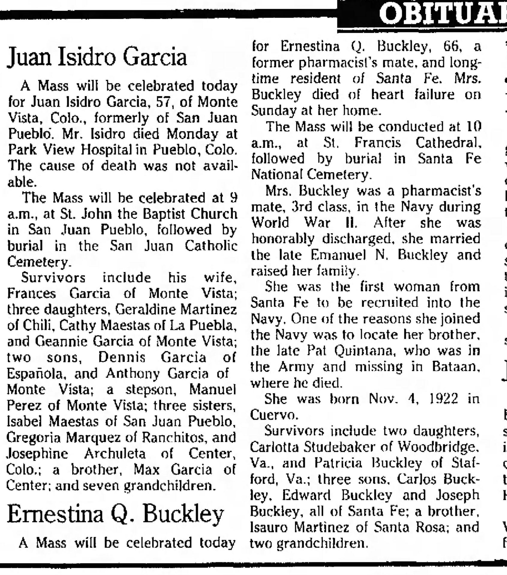 “Ernestina Q. Buckley,” The Santa Fe New Mexican, June 22, 1989, 4. Newspapers.com.