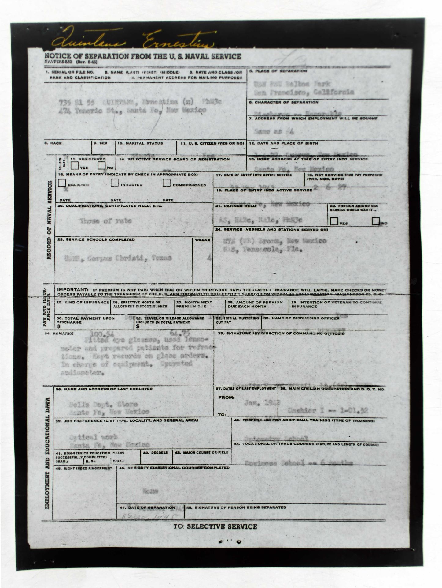 Ernestina Herminia Quintana (Buckley) joined the Navy Women Accepted for Volunteer Emergency Service (WAVES) in 1943, one of the first women to join from Santa Fe. 1, 2, 3 She joined in part to search for her brother Pat Quintana, an Army soldier who went missing in Bataan. 4 She completed basic training at Hunter College in New York City where she served as a platoon leader. 5, 6 Following basic training, Quintana received a month of hospital corps training at the Naval Hospital in Corpus Christi, Texas. 5, 6, 7 She said of her training, “The training was rather intensive but now I’m glad it was. It will help me in trying for promotion to pharmacist’s mate.” 5 Her first post of duty was at the Naval Hospital in Pensacola, Florida. 8 She was honorably discharged in December 1945. 7