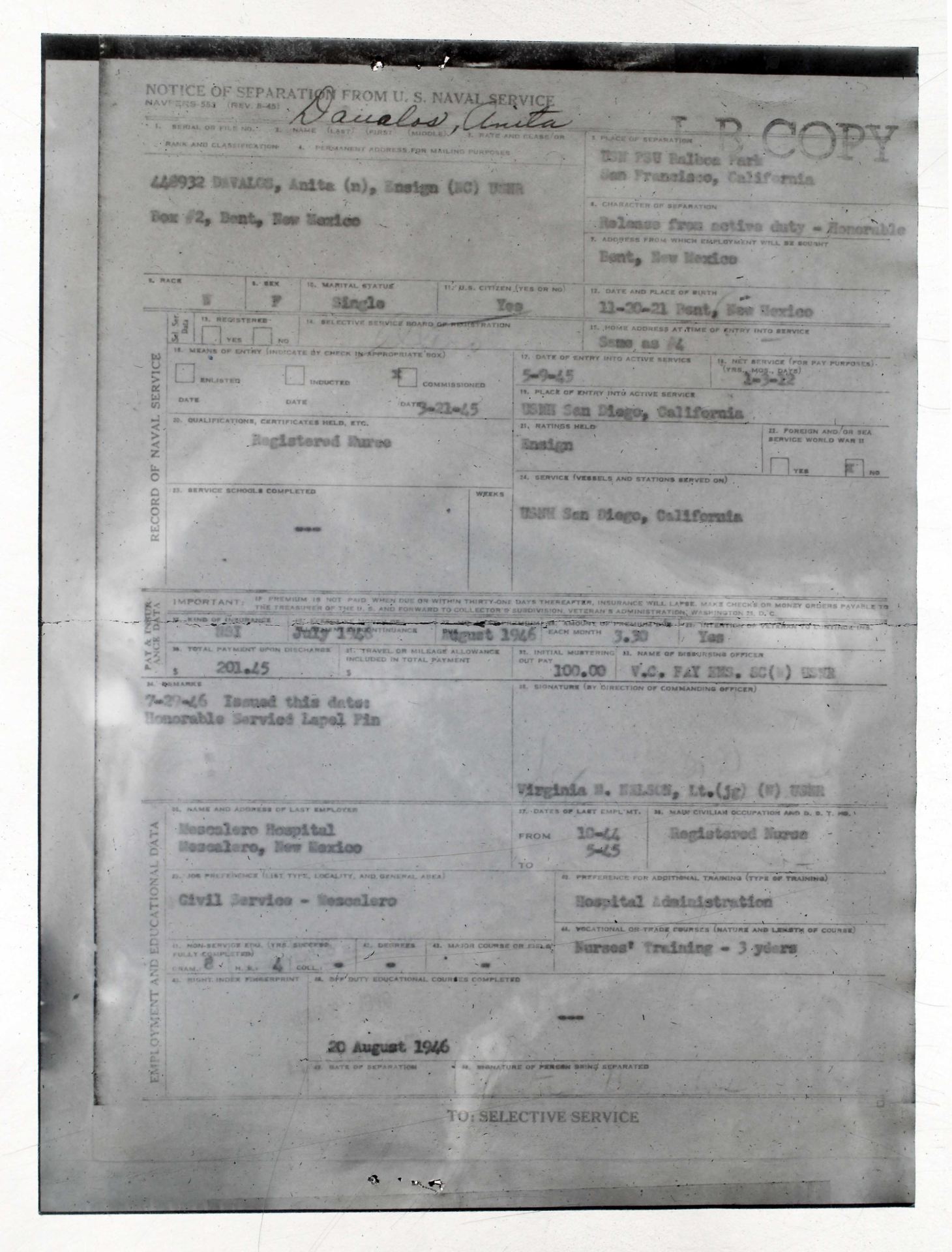Notice of Separation from US Naval Service: Ancestry.com. New Mexico, U.S., World War II Records, 1941-1945 [database on-line]. Provo, UT, USA: Ancestry.com Operations, Inc., 2015.