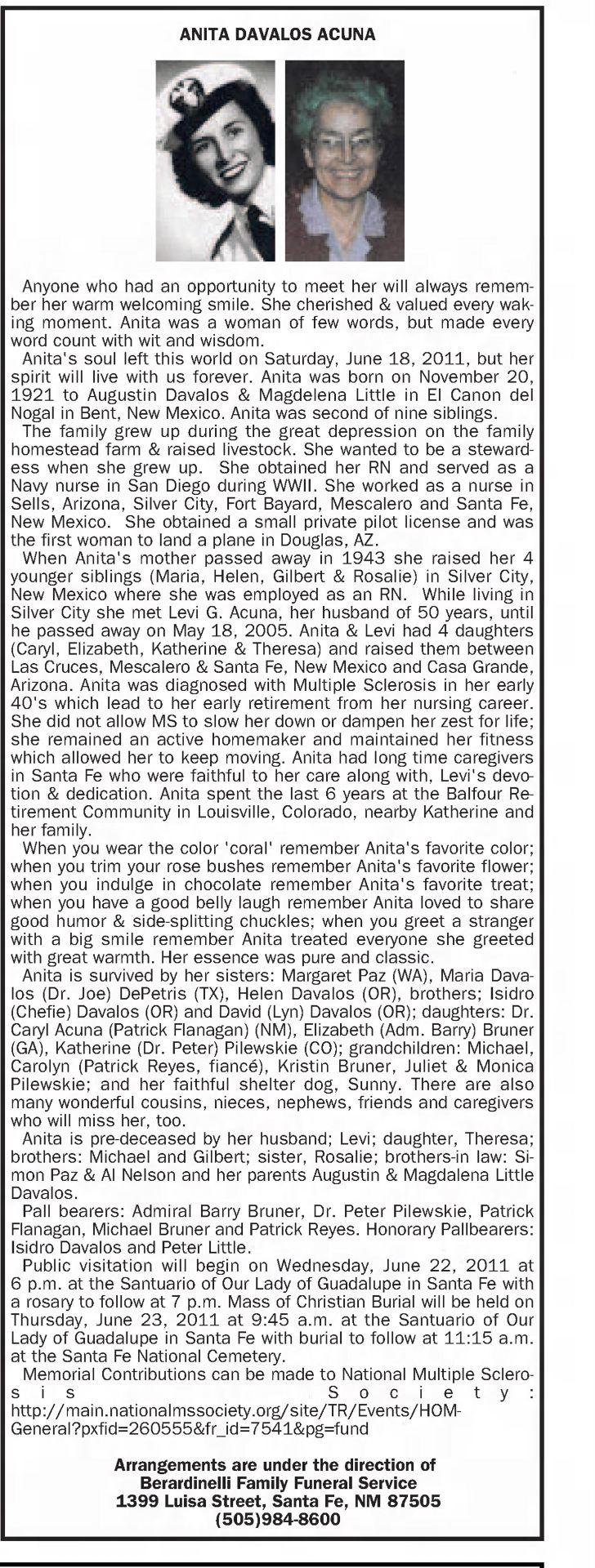 - “Anita Davalos Acuna,” The Santa Fe New Mexican, June 22, 2011, A10. Newspapers.com.