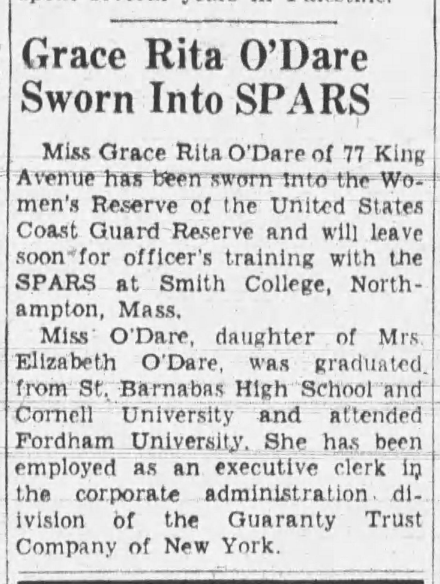 1. “Grace Rita O’Dare Sworn into STARS,” The Herald Statesman, February 4, 1943, 11. Newspapers.com.