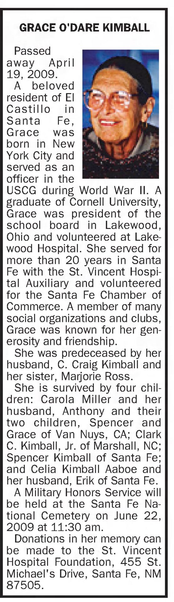 3. “Grace O’Dare Kimball,” The Santa Fe New Mexican, May 3, 2009, C002. Newspapers.com.