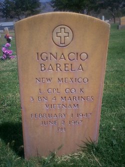 LCpl Ignacio Barela was born in Alamogordo New Mexico the son of Jose D. and Manuel Barela. He attended Alamogordo high School.1 Ignacio Barela arrived in Vietnam and was assigned to Kilo Company, 3rd Battalion, 4th Marine Regiment, 3rd Marine Division. He was wounded by friendly fire on hill 117 near Con Thein 25 May 1967 and died of his wounds on 2 June 1967. He was 20 years old.2