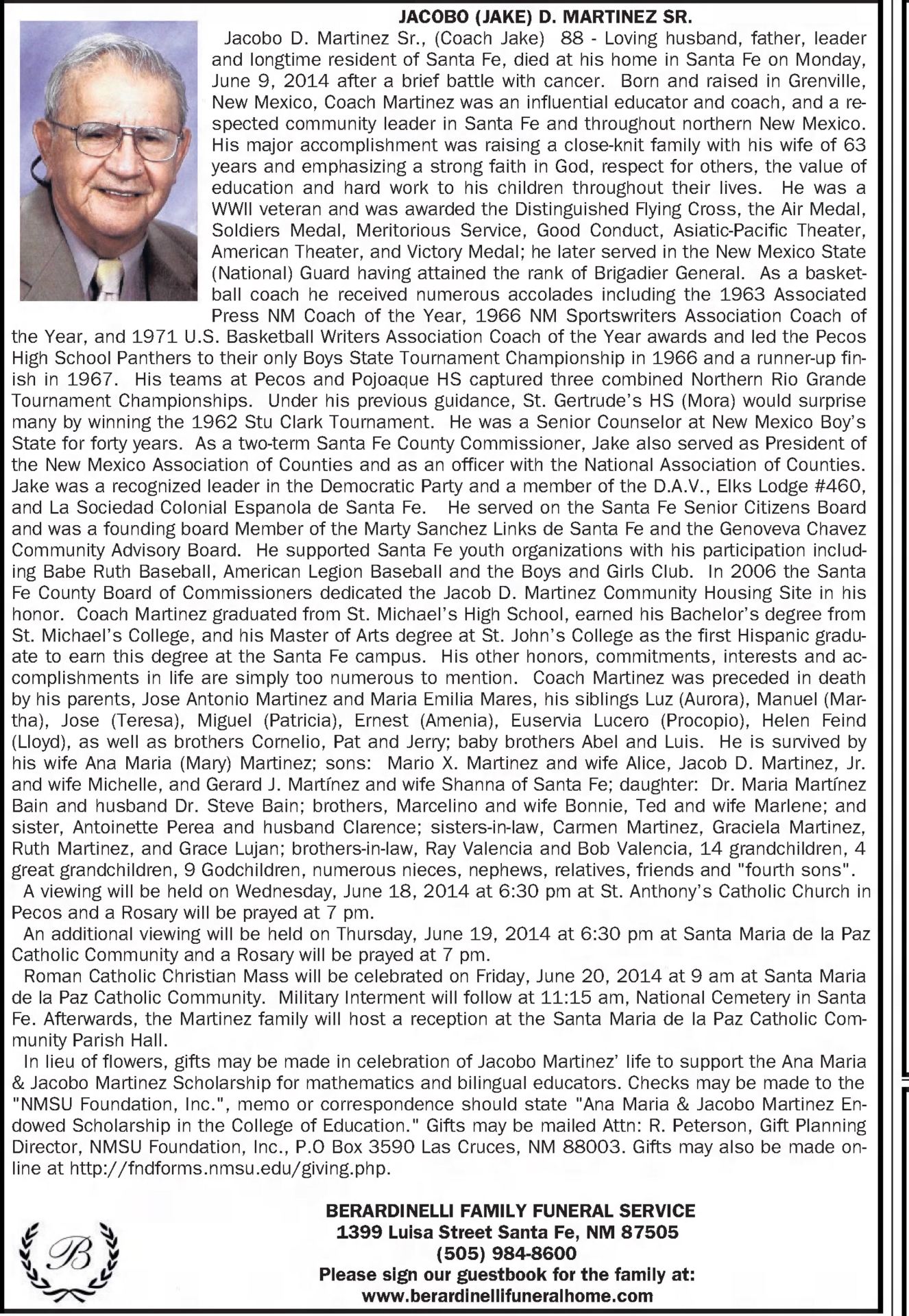 - “Jacobo ‘Jake’ D Martinez, Sr. “The Santa Fe New Mexican, June 18, 2014, B-2.