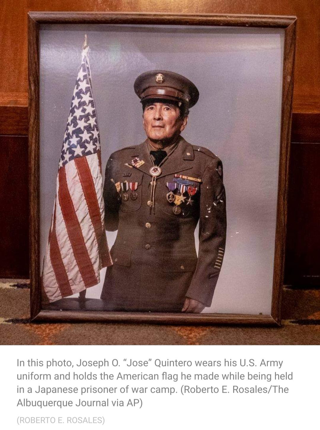 Joseph “Jose” Quintero was born on September 19th, 1918, in Fort Worth, Texas to parents, Faustino Quintero and Lorenza Olivas. During World War II, he served as a corporal in the United States Army. He was captured on the Island of Corregidor in the Philippines and endured four and a half years as a prisoner of war. During his imprisonment, he managed to make an American flag that was inspirational to his fellow POWs and to others after the war ended. He was awarded numerous medals including the New Mexico Medal of Honor, Silver Star, Bronze Star, and Purple Heart. The story of this flag is well documented in books and articles of World War II history.