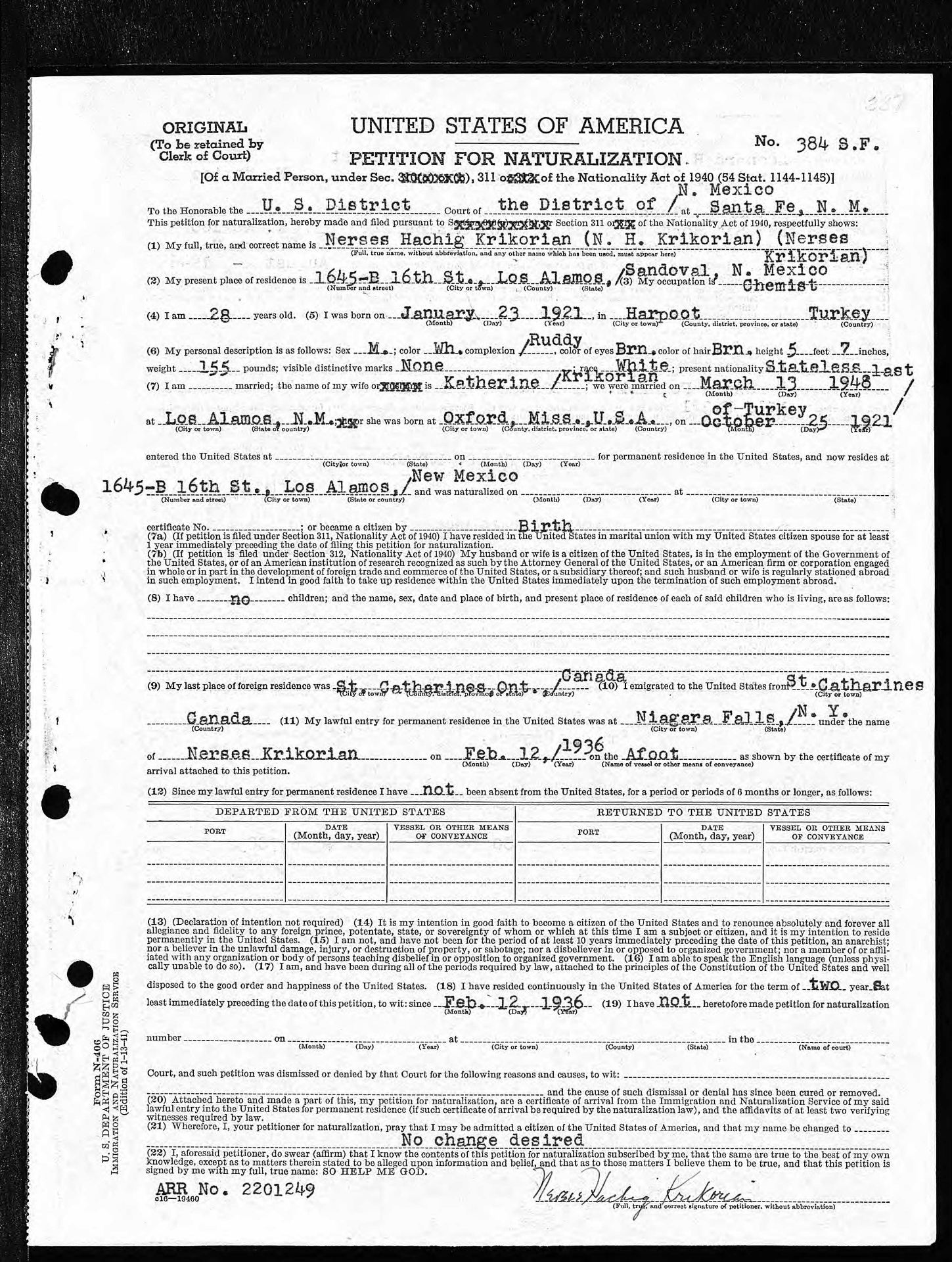 - National Archives at Denver; Broomfield, CO; ARC Title: Naturalization Records, New Mexico, 1882-1983; NAI Number: 1055070; Record Group Title: New Mexico, Santa Fe County, Naturalization Records; Record Group Number: Rg 21