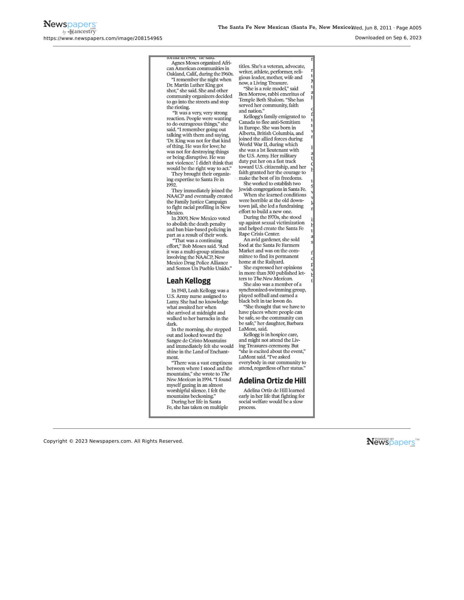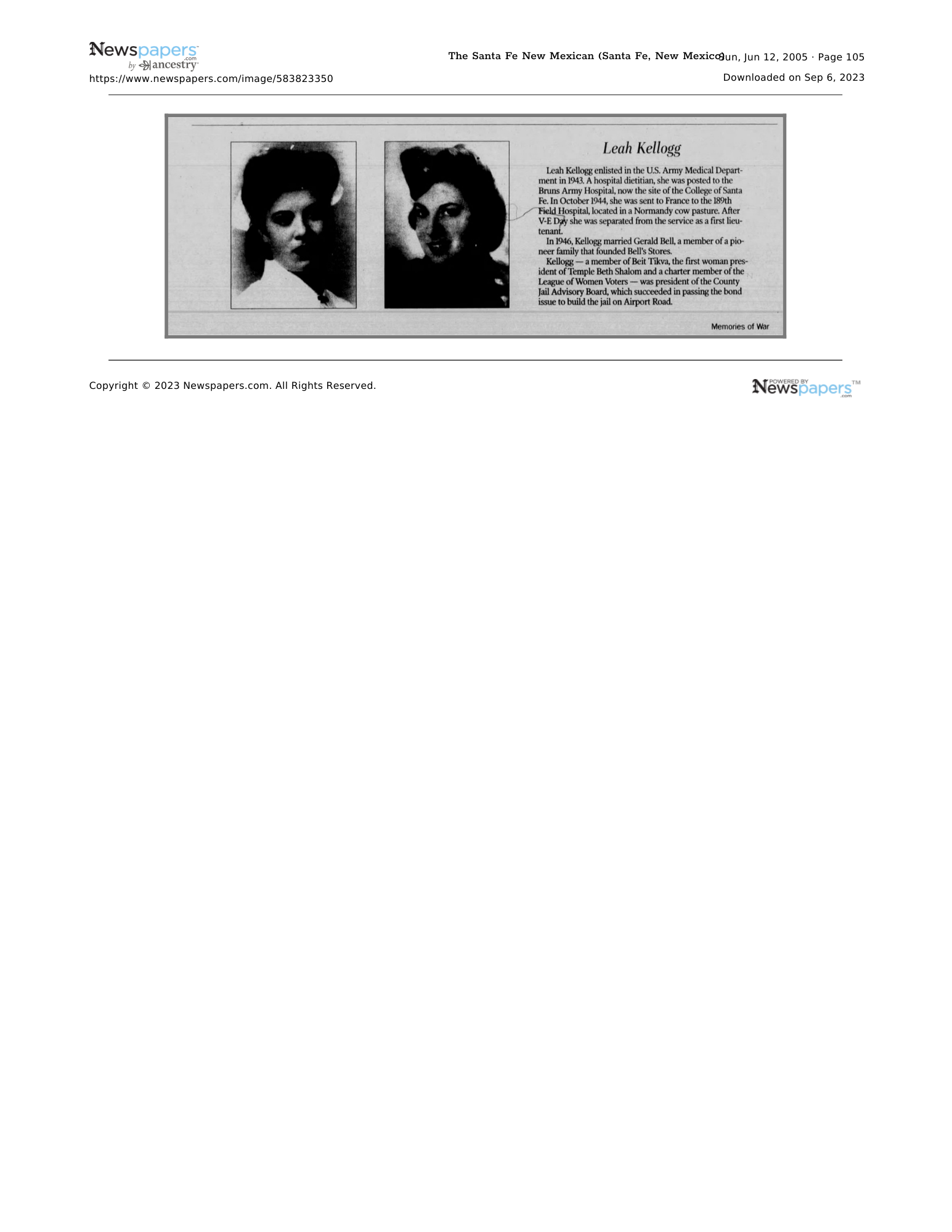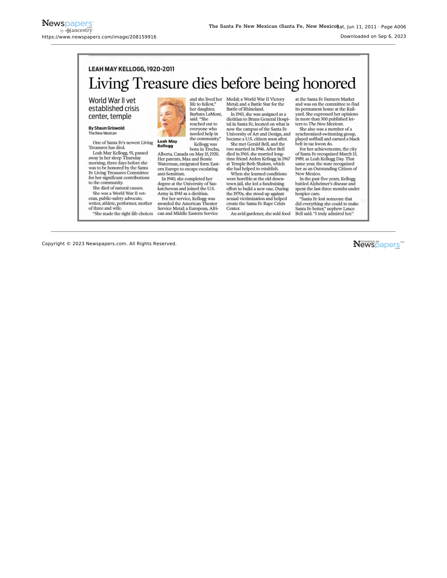 “Leah May Waterman Bell Kellogg.” Santa Fe New Mexican. Santa Fe, New Mexico. 11 June 2011. Retrieved: 6 September 2023. https://www.newspapers.com/image/208159916 p. 6.