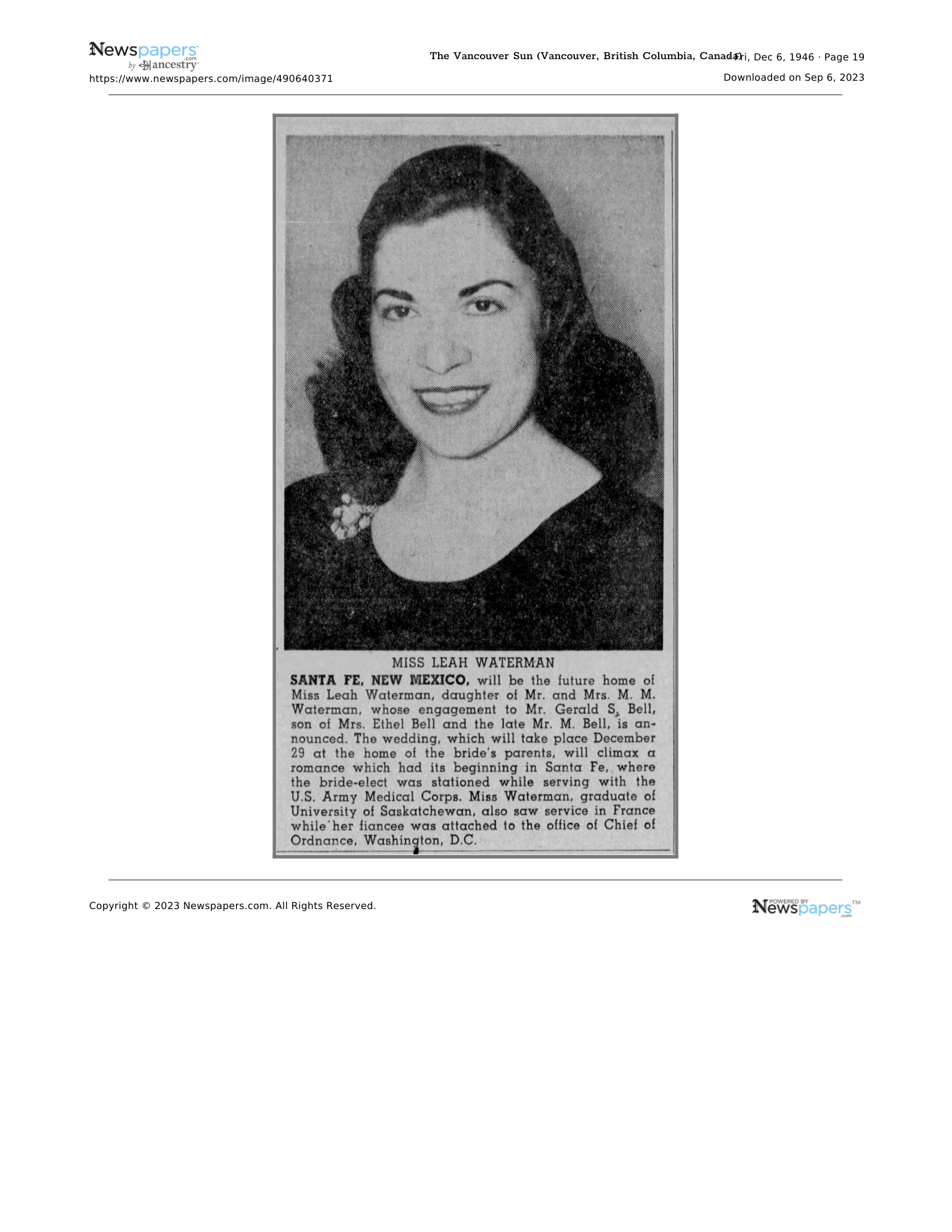 “Miss Leah Waterman marriage announcement.” Vancouver Sun. Vancouver, British Columbia, Canada. 6 December 1946. Retrieved: 6 September 2023. https://www.newspapers.com/image/490640371 p. 19.