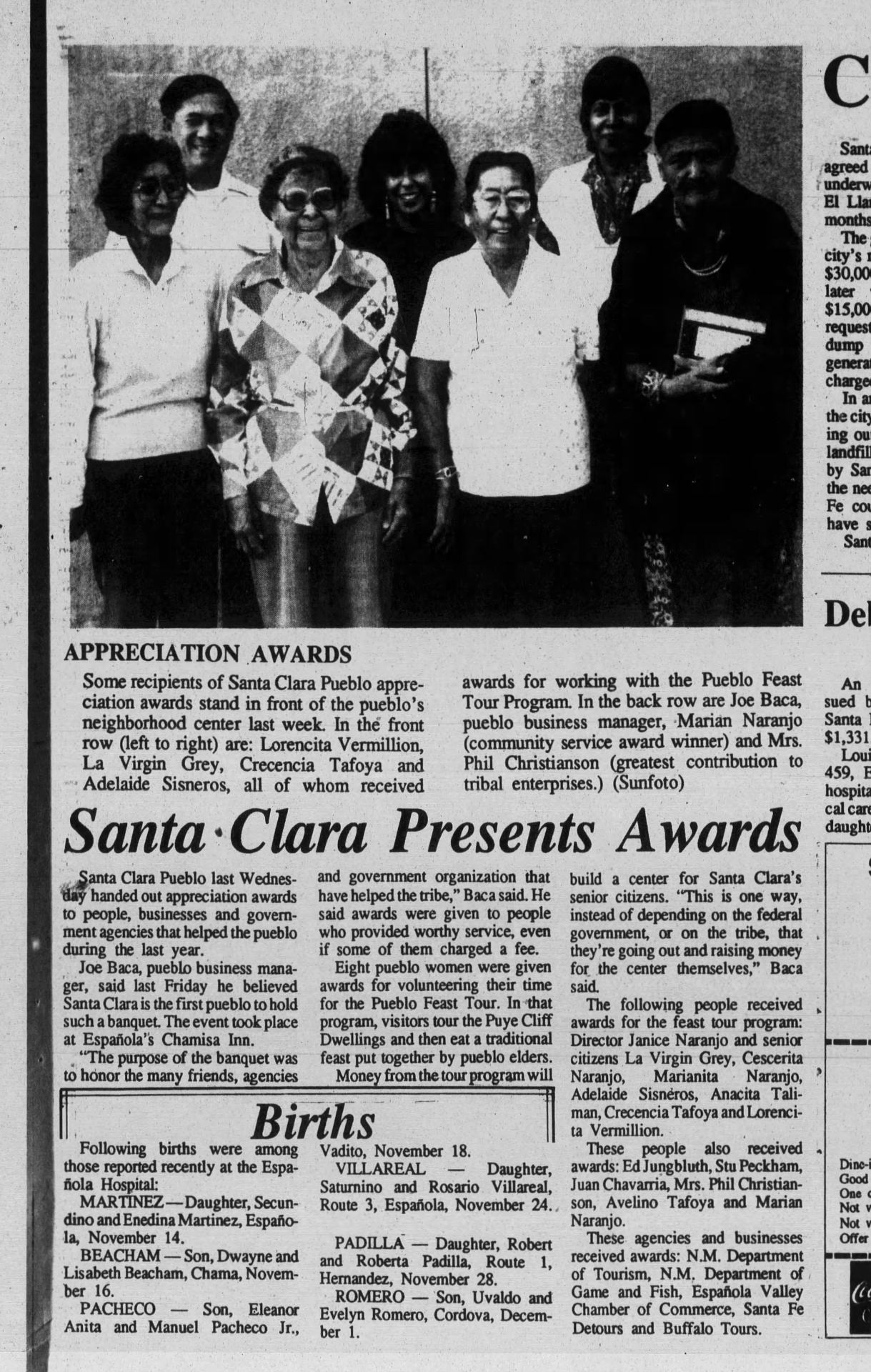 “Santa Clara Presents Awards.” Rio Grande Sun. December 11, 1986, 11. Newspapers.com.