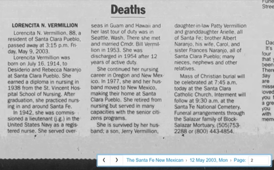 1. “Lorencita N. Vermillion.” The Santa Fe New Mexican. May 12, 2003, 2. Newspapers.com.