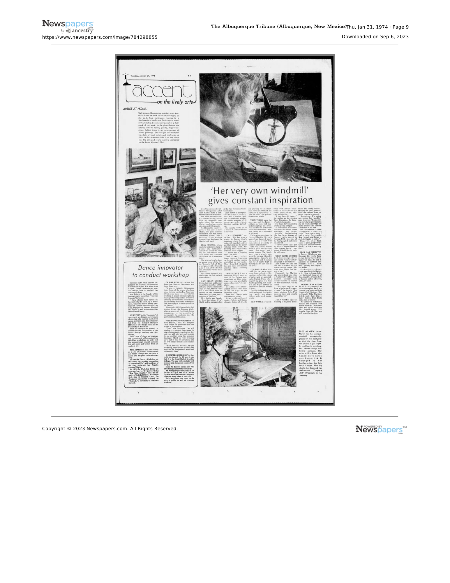 “’Her Very Own Windmill’ Gives Constant Inspiration.” Albuquerque Tribune. Albuquerque, New Mexico. 31 January 1974. Retrieved: 6 September 2023. https://www.newspapers.com/image/784298855