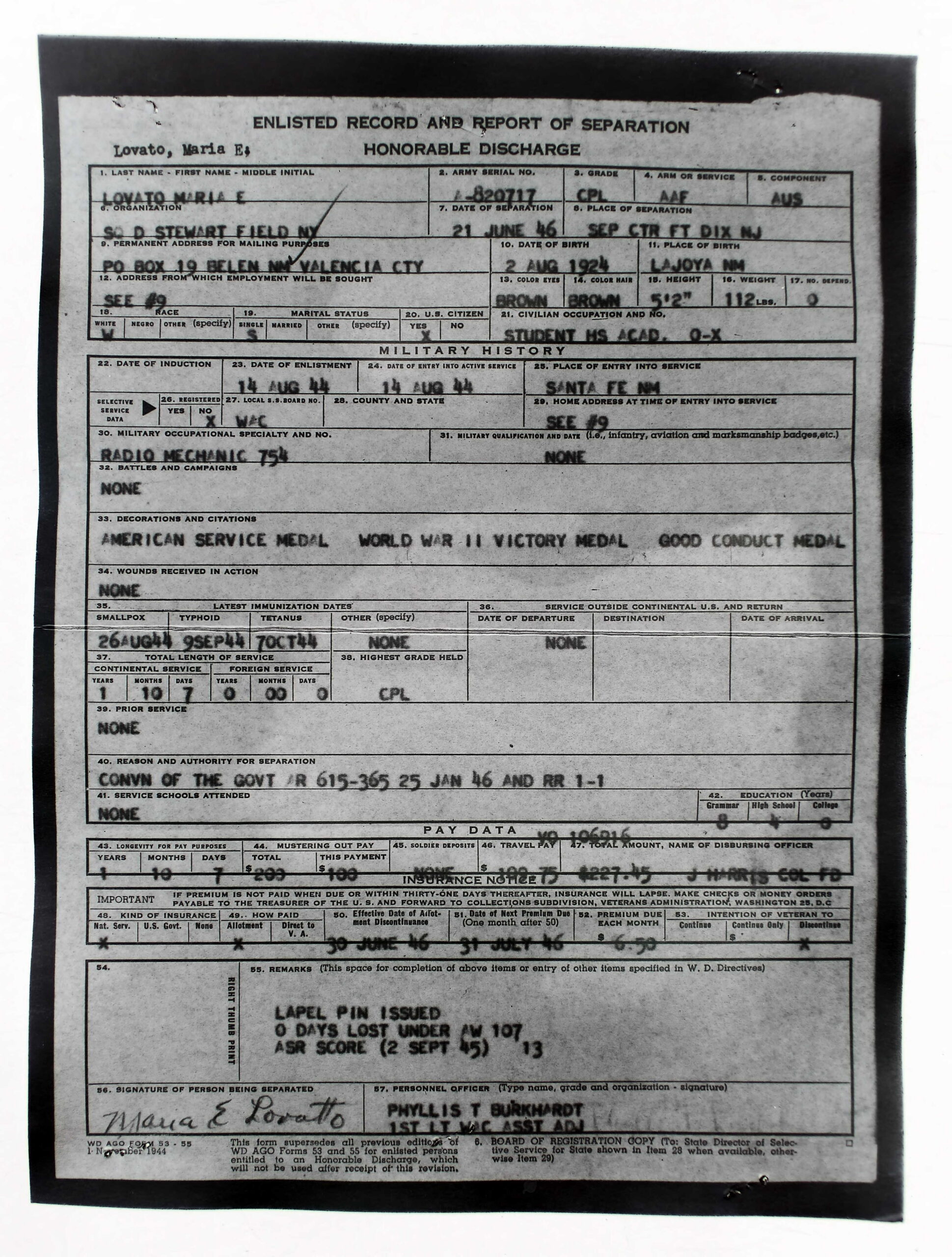 Maria Elena Lovato Cook enlisted in the Army Air Forces on August 14, 1944. Her military occupation was listed as a radio mechanic. During her time in the military, Lovato Cook was awarded the American Service Medal, the World War II Victory Medal, and the Good Conduct Medal. She left the military in 1946 at Fort Dix, New Jersey.