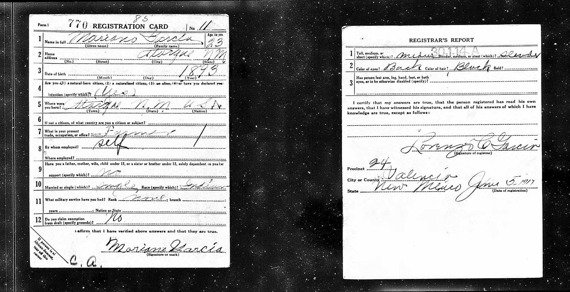 Mariano García was born in Atarque, New Mexico on 23 October 1894. He was described as “the servant and legally adopted son of Patricio García and his wife.”[i] The caveat that García was legally adopted points to his likely status as a genízaro—a term usually taken to mean a “detribalized Indian” and one that was sometimes used as a euphemism even as late as the mid-20th century to avoid description of an Indian as a slave.[ii]