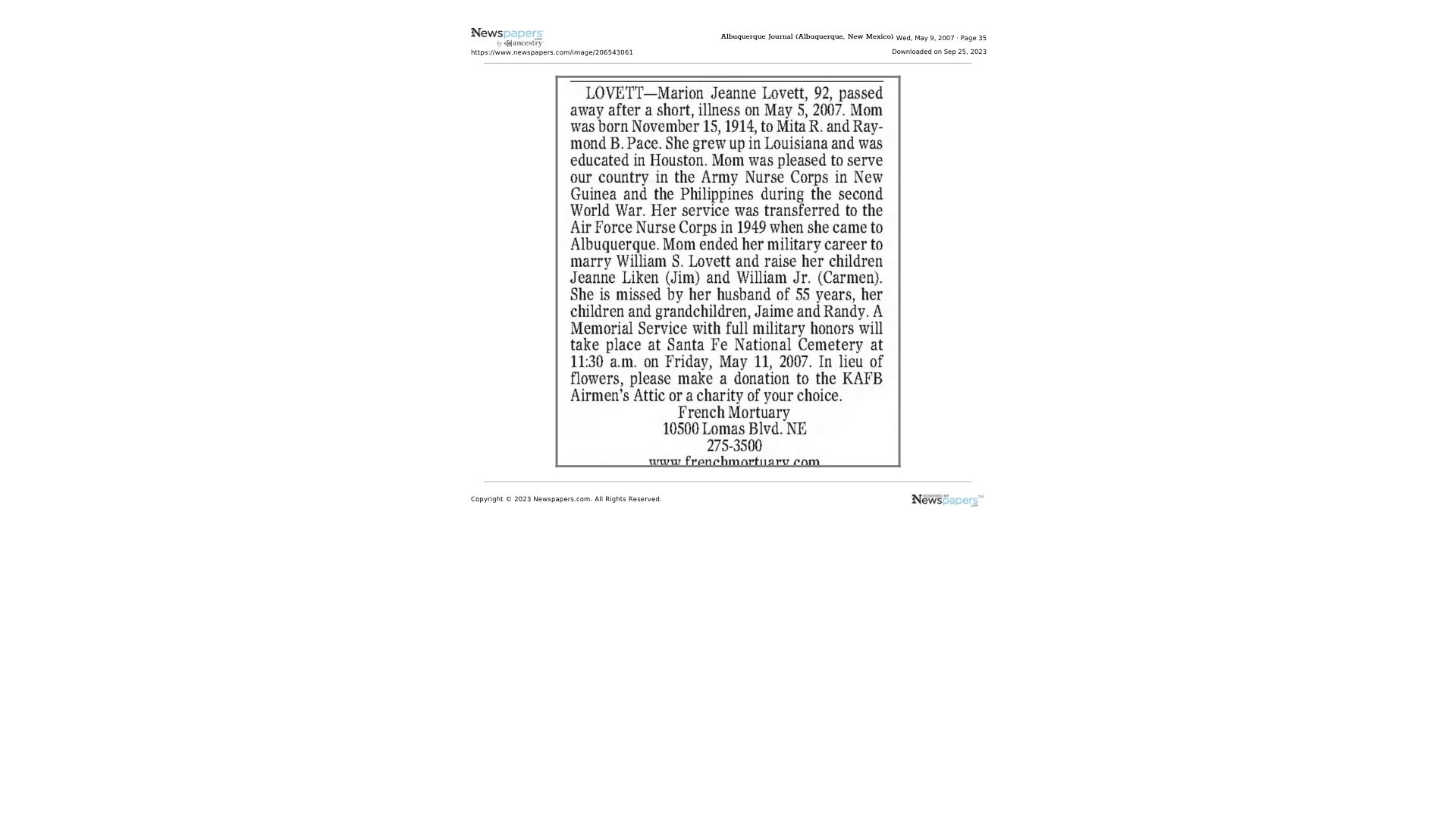 - Marion Jeanne Lovett. The Albuquerque Journal. May 9, 2007.