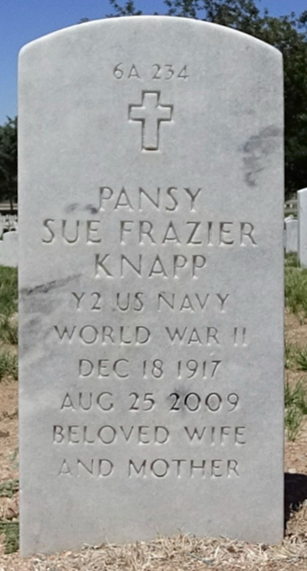 “Pansy Sue Frazier Knapp.” Find a Grave, database and images (https://www.findagrave.com/memorial/41193622/pansy-sue-knapp: accessed 12 July 2023), memorial page for Pansy Sue Frazier Knapp (18 Dec 1917–25 Aug 2009), Find a Grave Memorial ID 41193622, citing Santa Fe National Cemetery, Santa Fe, Santa Fe County, New Mexico, USA; Maintained by BJW (contributor 47343717).