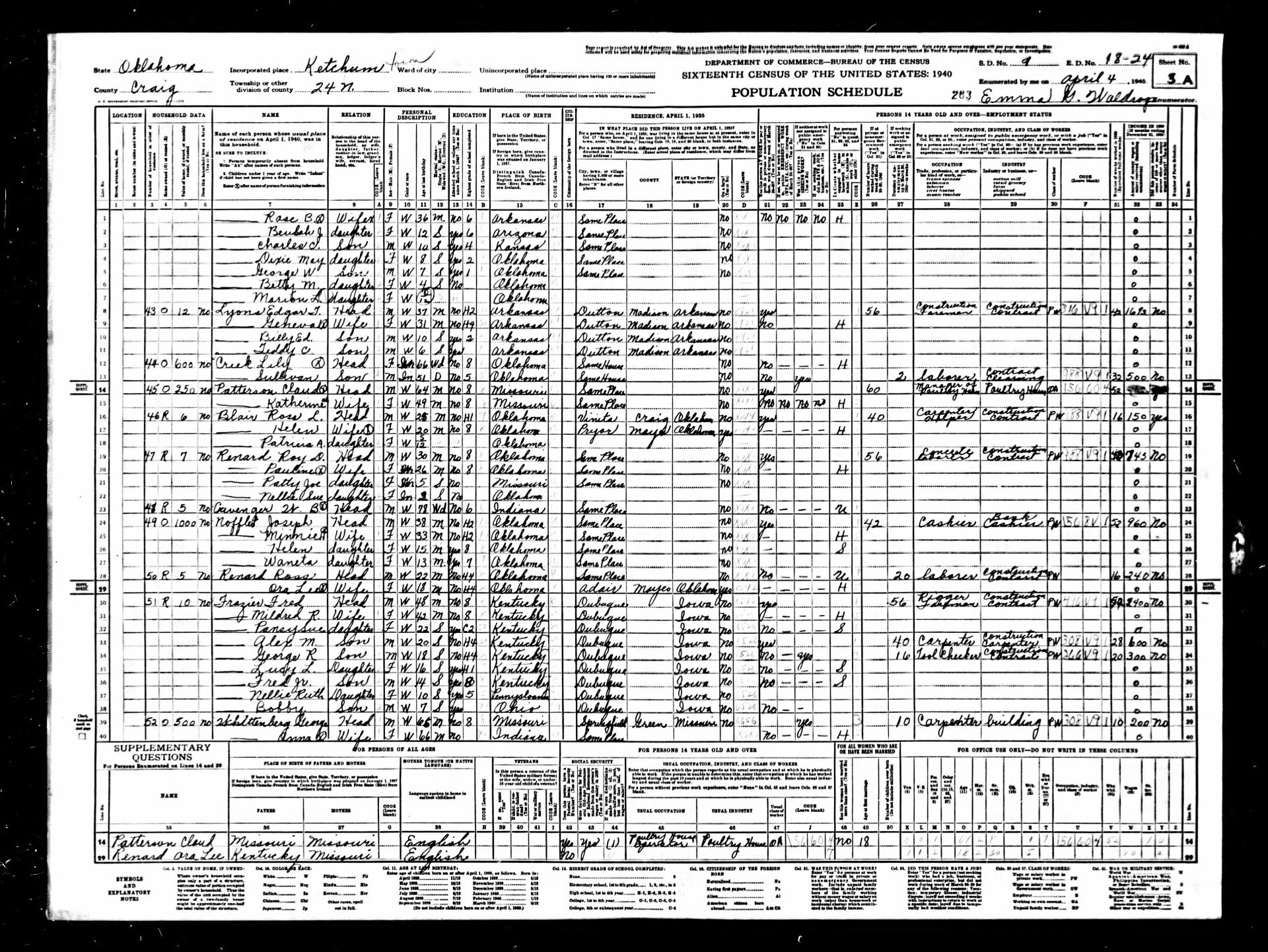 “Frazier.” Year: 1940; Census Place: Ketchum, Craig, Oklahoma; Roll: m-t0627-03287; Page: 3A; Enumeration District: 18-24.