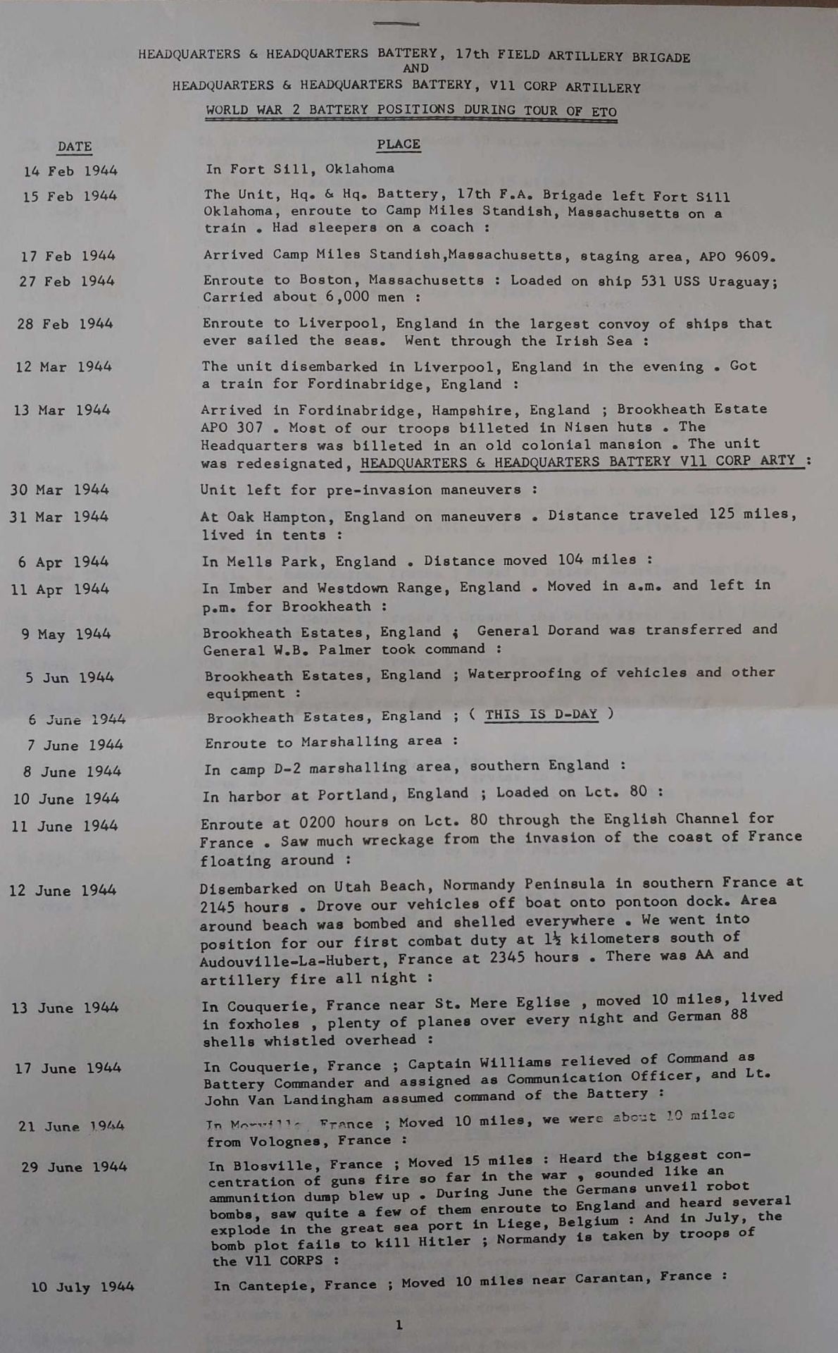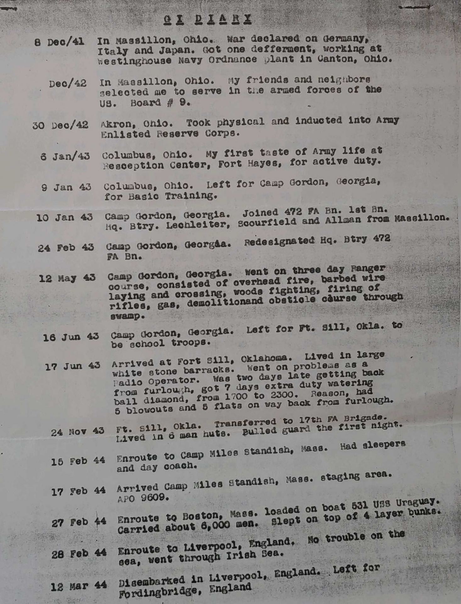 Typewritten G.I. Diary 1941 – 1944; Typewritten Position Notes, 1944