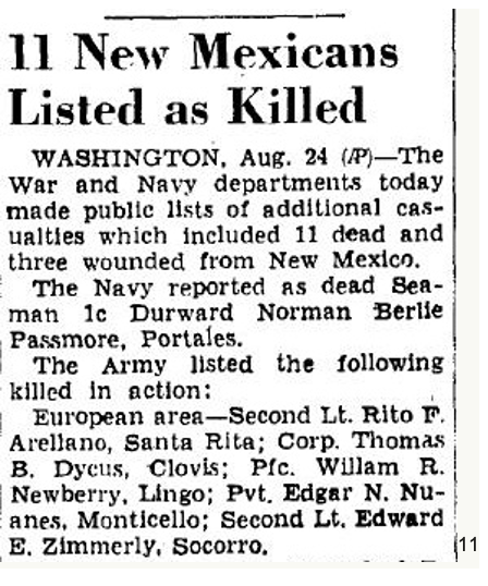 [iii] New Mexico Commission of Public Records, State Records Center and Archives; Santa Fe, New Mexico; Subsubseries: WWII Service Records (Biographical Questionnaires for New Mexicans Serving in the Armed Forces); Box Number: 13619; Box Title: Service Records Aa-Ad to Chi-Clo