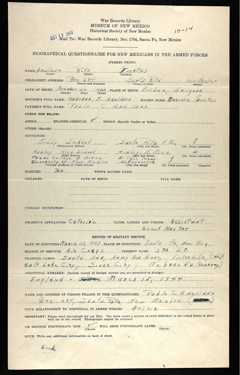 [iv] “Rito Fuentes Arellano.” Rito Fuentes Arellano : Second Lieutenant from New Mexico, World War II Casualty. Accessed September 20, 2023. https://www.honorstates.org/index.php?id=88636.