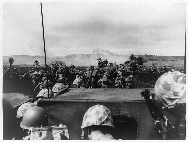 “A wave of charging Fourth Division Marines begin an attack from the beach at Iwo Jima, on D-Day as another boatload of battle-tested veterans is disgorged on the beach by an invasion craft.” Official Photographs of the USMC. 19 February 1945. Found at: Library of Congress. LOT 8754 [P&P;]. Digital ID number: cph 3b38740