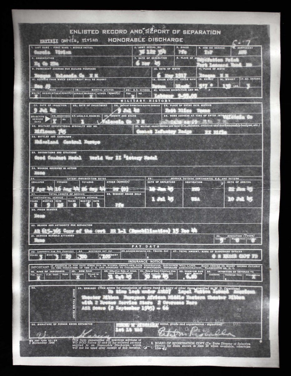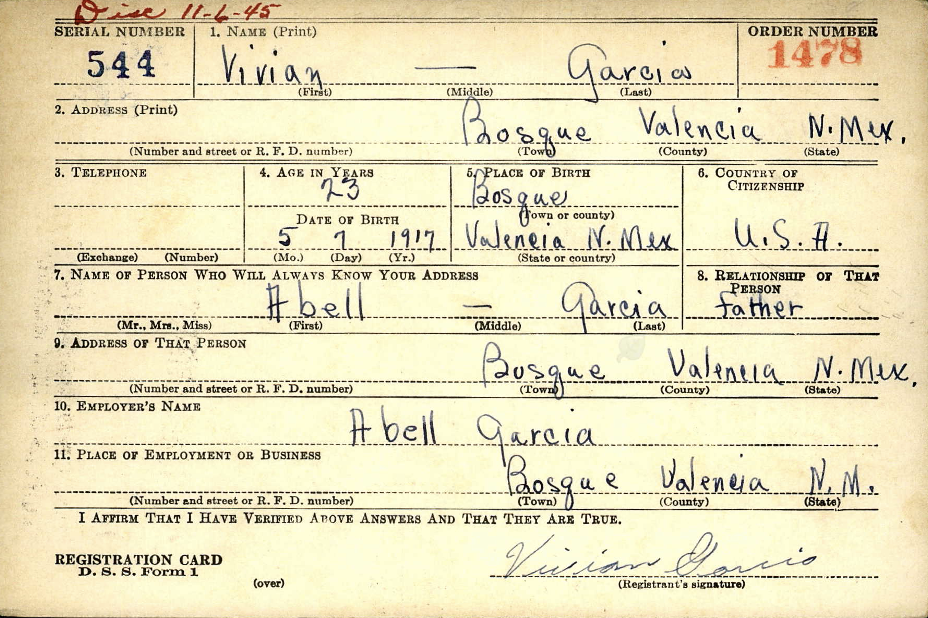 Vivian Garcia was born to Abel and Bersahe Garcia. He was raised in Bosque New Mexico. Vivian was their third child and the only son of their four children. He enlisted in the United States Army in July of 1942 and was honorably discharged as part of demobilization in December 1945.