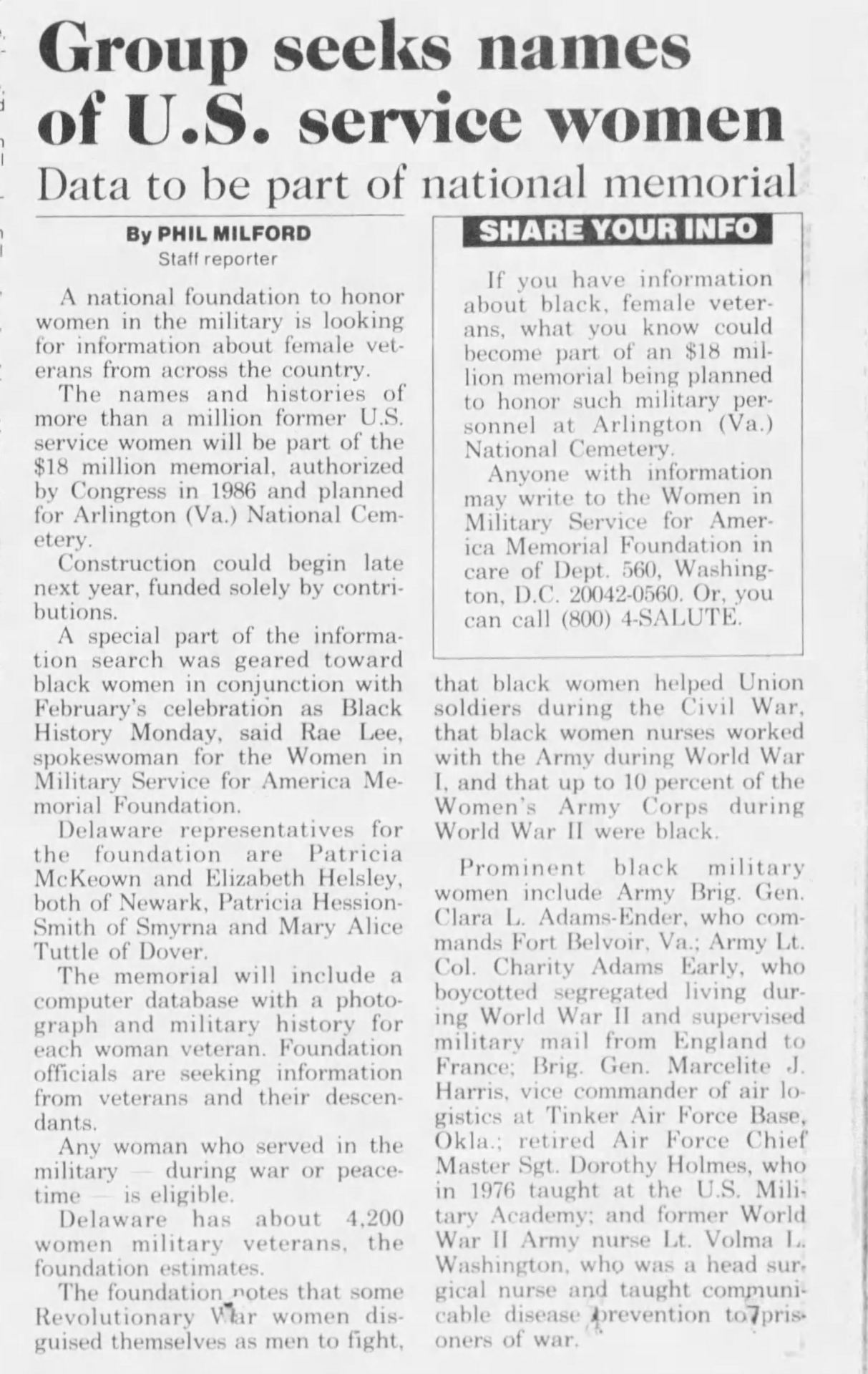 5. “Group Seeks Names of U.S. Service Women,” The News Journal, Wilmington Delaware, March 2, 1992, 7. Newspapers.com.
