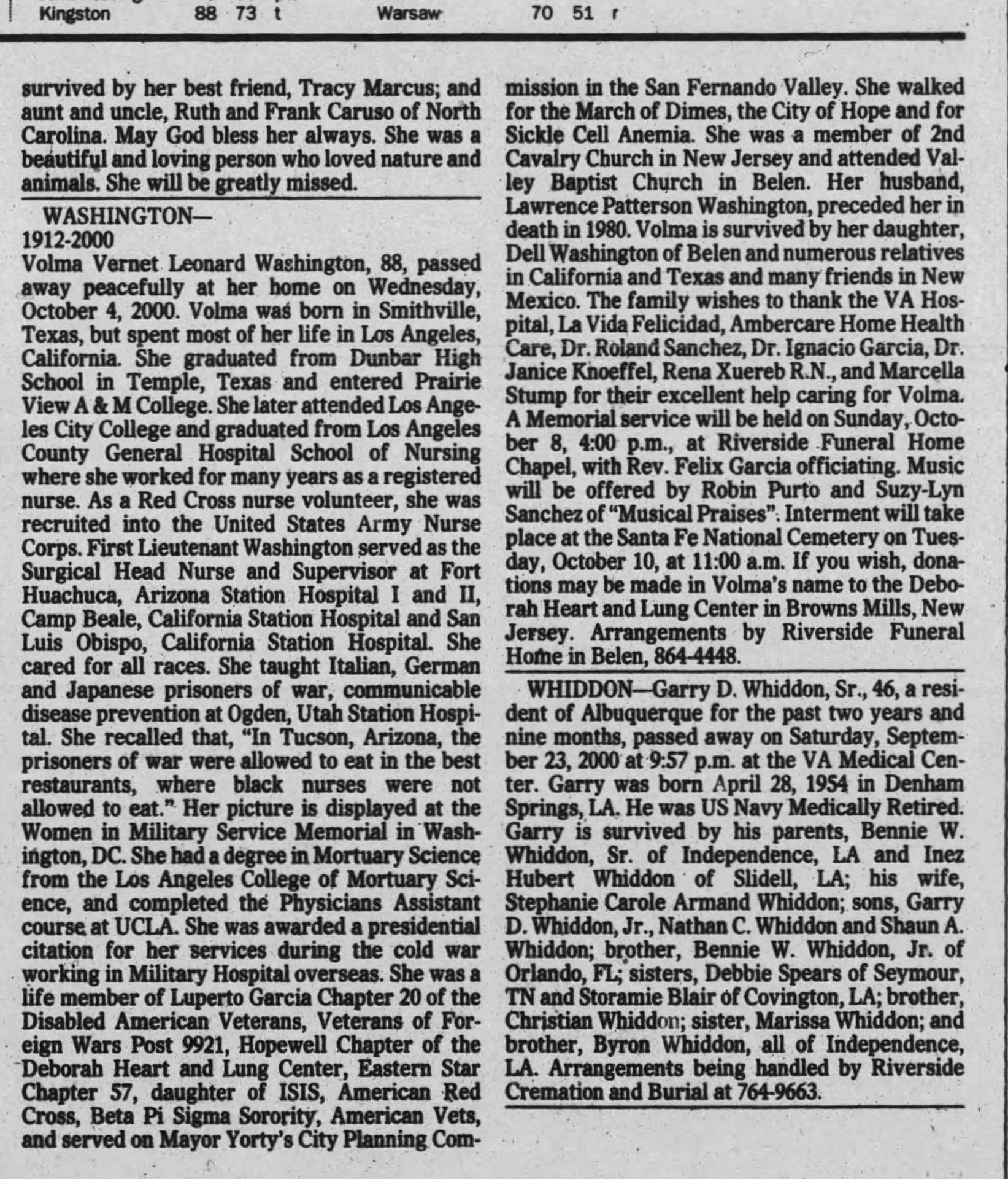 1. “Volma Vernet Leonard Washington,” Albuquerque Journal, October 7, 2000, 52. Newspapers.com.